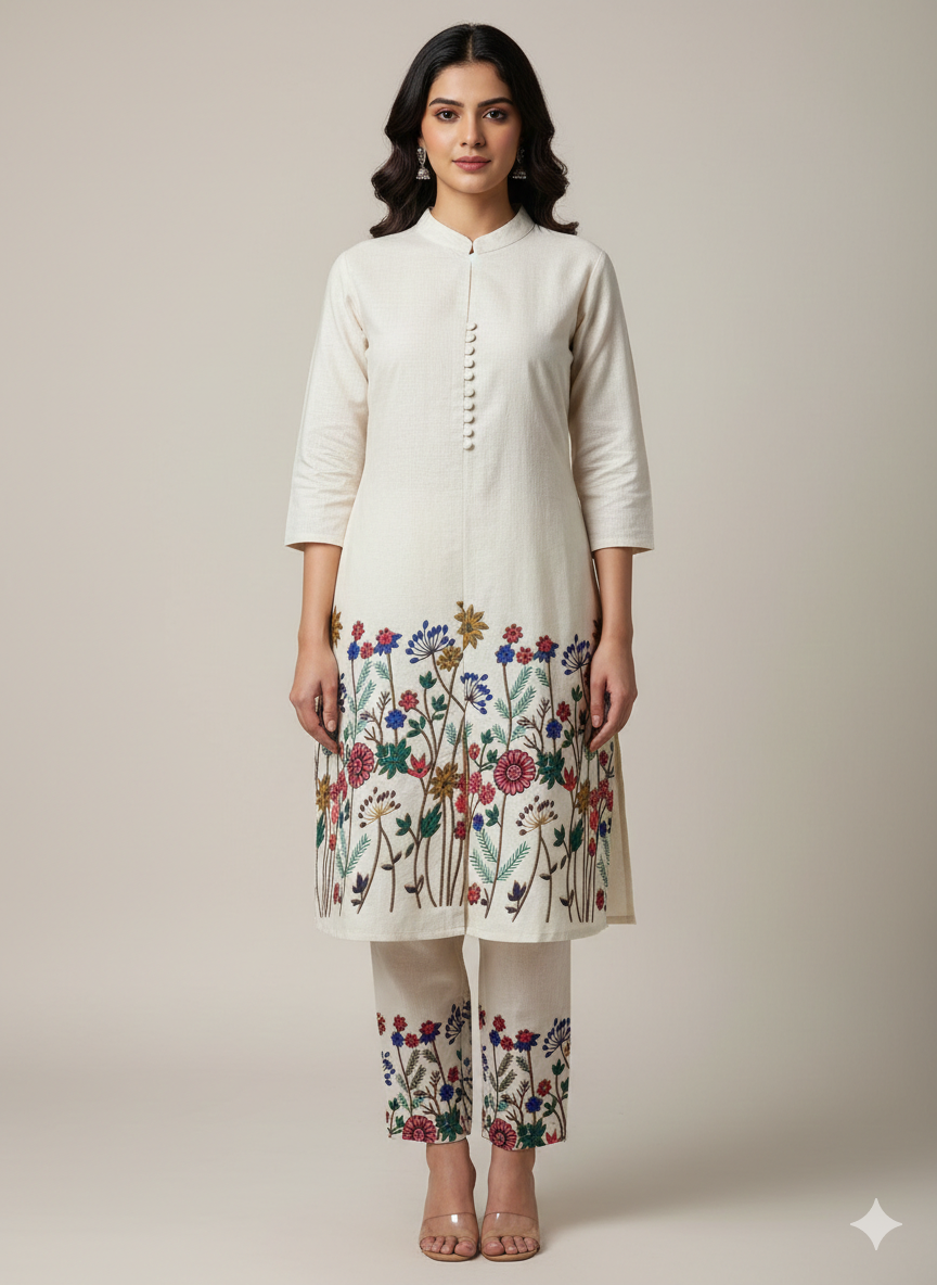 Colorful floral embroidery along the hemline creating a statement finish Mandarin collar neckline with clean front detailing for a modern look.